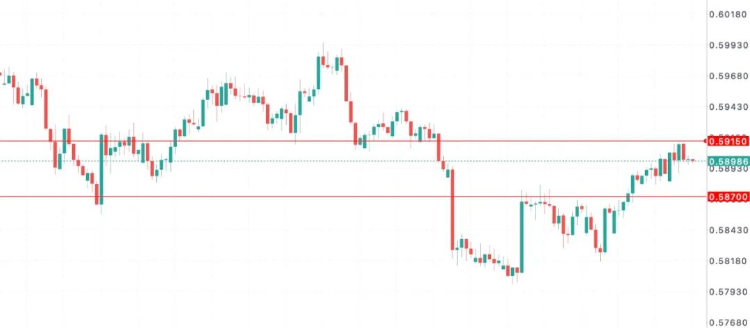 在4小时级别未站稳至0.5870一线区域下方之前,短线保持谨慎多头对待。但由于今日即将公布的美国PMI指数催化,仍需对其突破信号所引发的“诱导”风险保持相对谨慎。